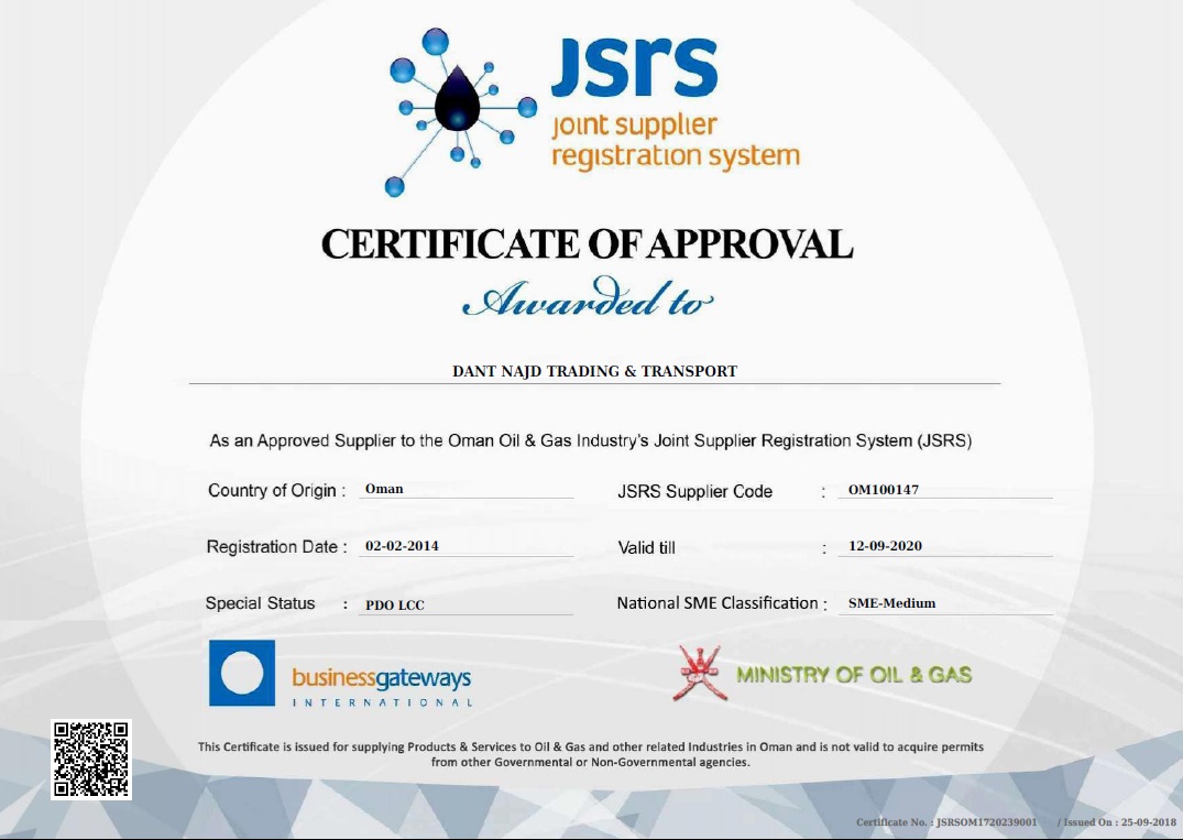 Dant Najd registered and certified under JSRS, the Joint Supplier Registration System, an In-Country Value (ICV) initiative of Oman Ministry of Oil & Gas and its Operators.